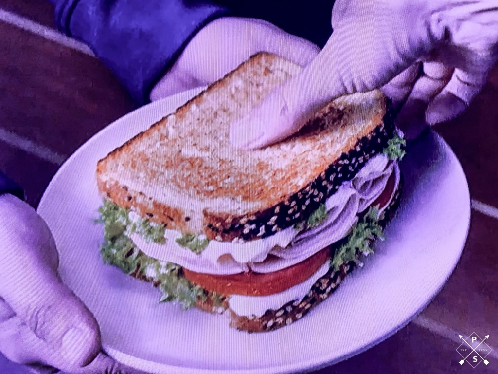 Two hands pan in from the right hand corner of the frame holding a presentation style plate that covers most of the center of the frame. On the plate is a delectable well proportion neatly stuffed turkey sandwich can be appreciated gently peeking from two sides and corners of the sandwich. The sandwich contains lettuce, turkey mayonnaise, and a healthy portion of turkey. A feminine hand pans in from the left top corner of the screen, as if receiving and greatly accepting by picking up the sandwich.