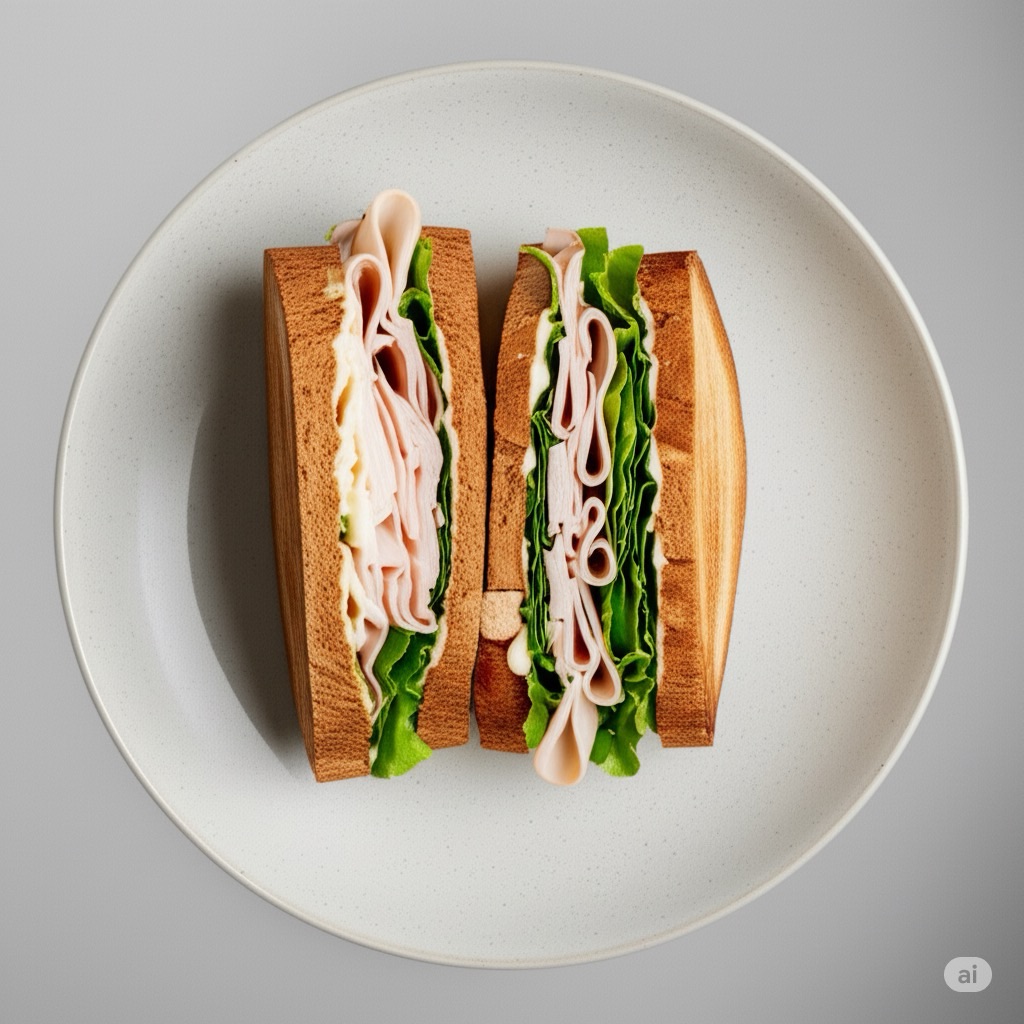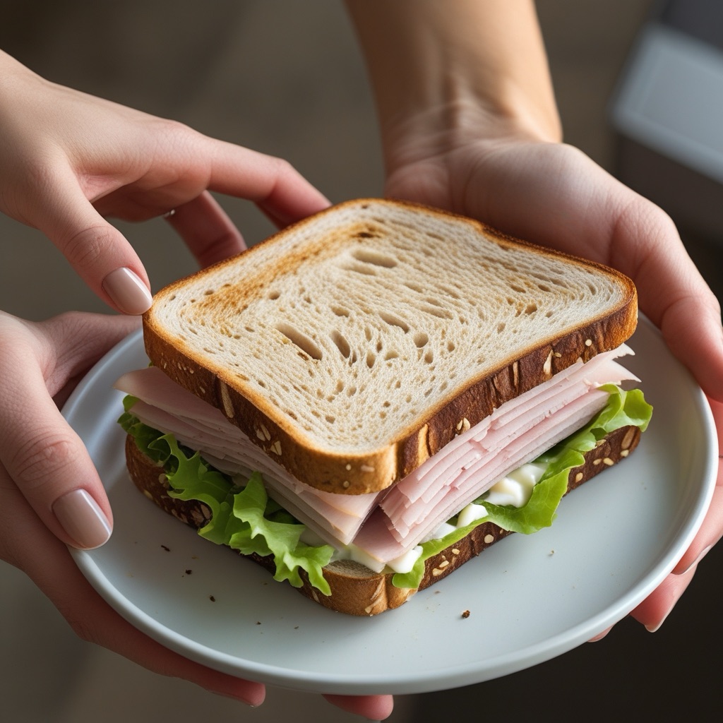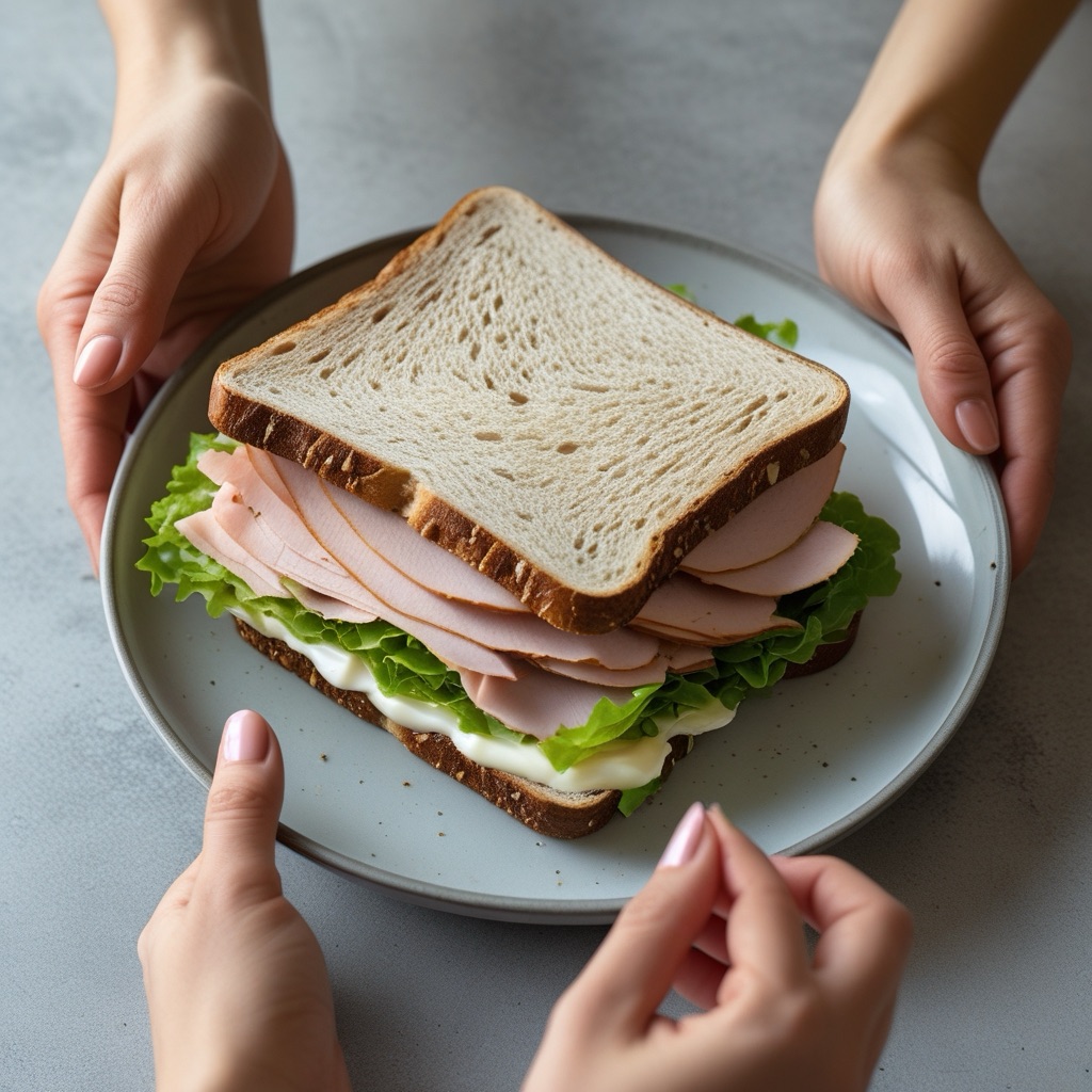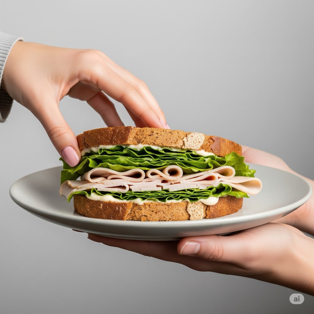 Two hands pan in from the right, presenting a plate that fills most of the frame. On it rests a delectable, perfectly portioned rye and turkey sandwich, neatly stuffed and gently peeking from two sides. Inside, you can appreciate crisp lettuce, a generous portion of thinly sliced turkey, and a creamy spread of mayonnaise. From the top left, a feminine hand glides in, poised to pick up the sandwich, conveying a sense of genuine delight.