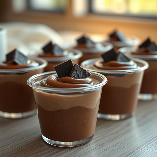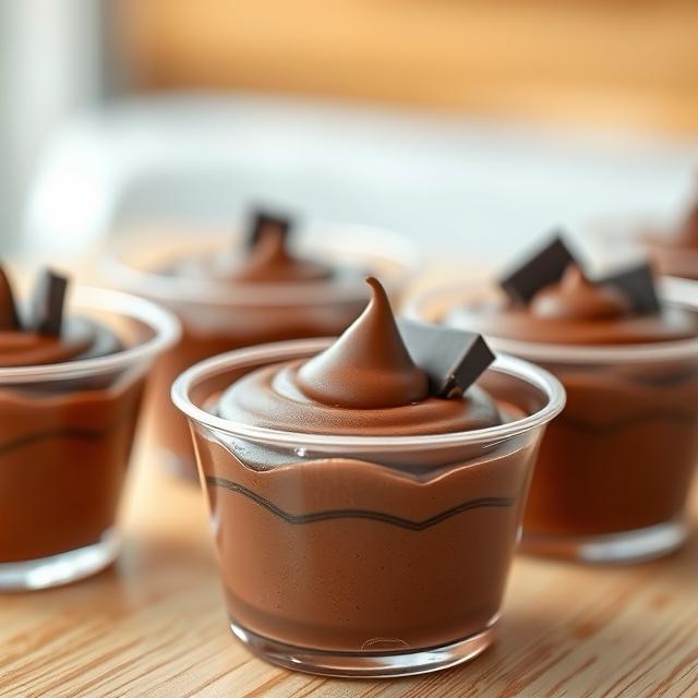 A chocolate mousse dessert served in small clear plastic cups, featuring a creamy texture with a spiral top finish. Each cup is topped with dark chocolate shavings. The cups are arranged on a light wooden table, with soft, natural lighting highlighting the mousse’s shine. Blurred background, realistic photographic style, focus on texture and chocolate gloss.