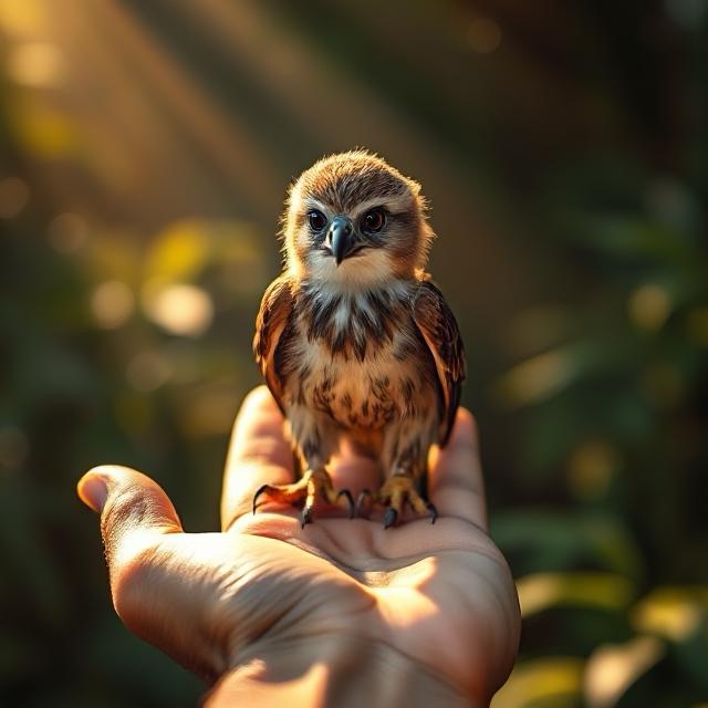 A hyper-realistic and highly detailed image of a super tiny, extremely cute and slightly chubby eagle standing on the palm of a human hand. The eagle has soft, large round eyes, and tiny claws. The hand is gently cupped with natural tanned skin texture and lighting, showing scale and contrast between the eagle tiny size and the human hand. The background is softly blurred to focus attention on the eagle with warm, natural lighting that adds depth and realism.