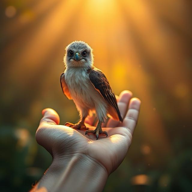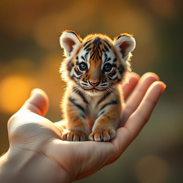 A tiny, incredibly cute [animal, e.g., baby elephant, fox cub, kitten, puppy] standing perfectly balanced in the palm of a human hand. The animal should have large, expressive eyes and soft, fluffy fur. The lighting is soft and warm, creating a gentle glow around the animal. The background is softly blurred (bokeh effect), with a hint of warm, natural light. Emphasize extreme cuteness, detailed fur, and a sense of wonder. Photorealistic, shallow depth of field, warm tones.