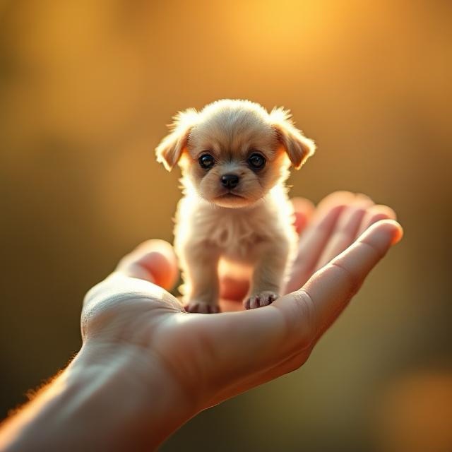 A tiny, incredibly cute baby puppy standing perfectly balanced in the palm of a human hand. The animal should have large, expressive eyes and soft, fluffy fur. The lighting is soft and warm, creating a gentle glow around the animal. The background is softly blurred (bokeh effect), with a hint of warm, natural light. Emphasize extreme cuteness, detailed fur, and a sense of wonder. Photorealistic, shallow depth of field, warm tones.