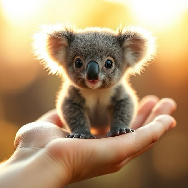 A tiny, incredibly cute baby koala-bear standing perfectly balanced in the palm of a human hand. The animal should have large, expressive eyes and soft, fluffy fur. The lighting is soft and warm, creating a gentle glow around the animal. The background is softly blurred (bokeh effect), with a hint of warm, natural light. Emphasize extreme cuteness, detailed fur, and a sense of wonder. Photorealistic, shallow depth of field, warm tones.