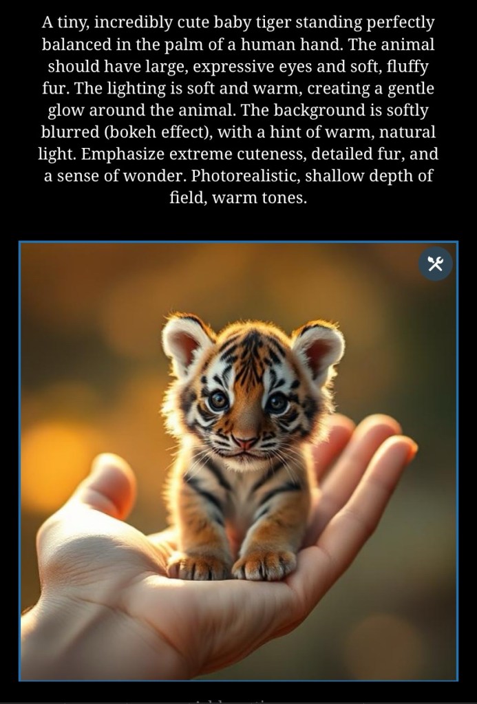 - Text-to-Image Synthesis: This is the most revolutionary aspect. Users can simply type descriptive text prompts (e.g., “a tiny, incredibly cute prehistoric baby sabertooth-tiger standing perfectly balanced in the palm of a human hand”) and the AI generates a corresponding image. This democratizes image creation, allowing anyone to be a “creator” without traditional artistic skills.