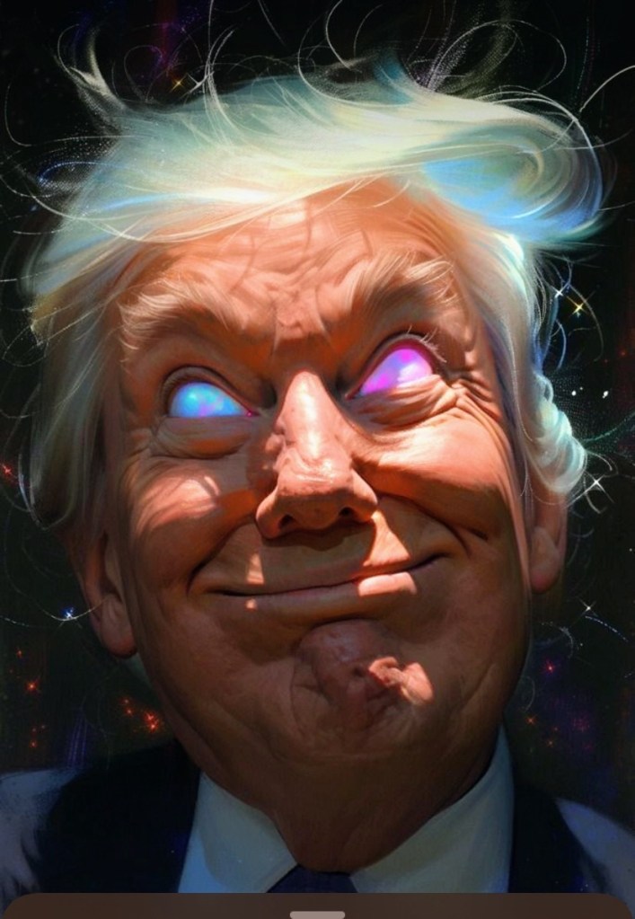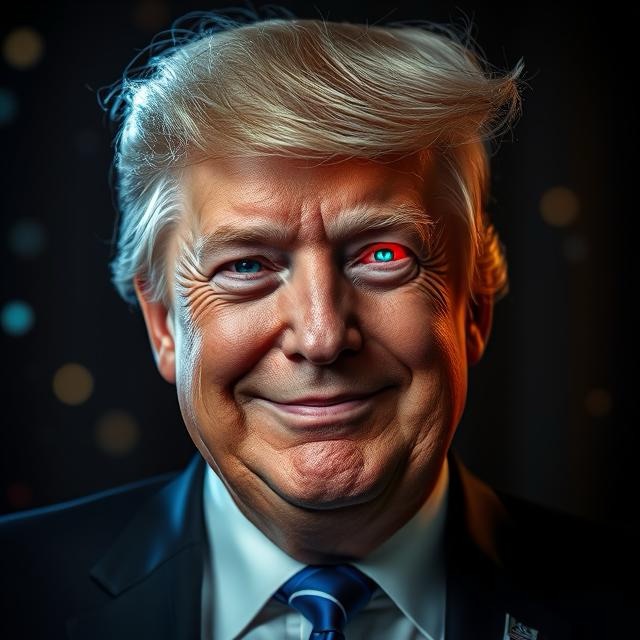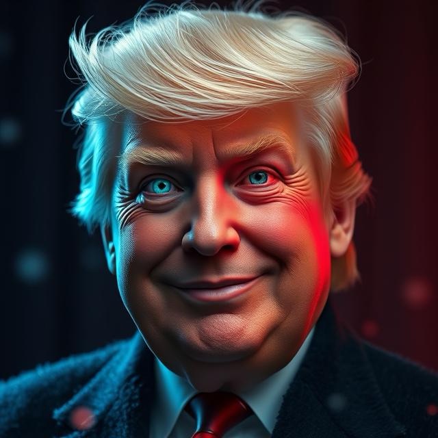 Create a hyper realistic whimsical, depiction ofportrait style of President Donald Trump, smiling for the camera at a full frontal perspective. His hair waves magically as if in motion. His eyes one is a magically, glowing eyes of turquoise and the other eye shining brilliantly of Red Hughes the background is dark and dimly lit in the foreground little sparks sparkles as if confetti like. A 4K image quality for showcasing.