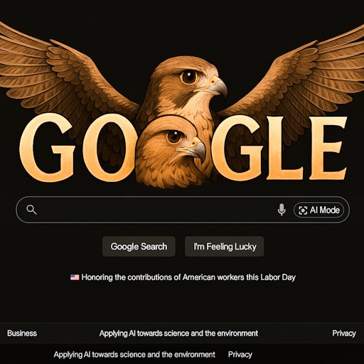 On this Labor Day, we reframe the fleeting homepage into a monument of flight. The falcon—symbol of vigilance, precision, and ancestral pride—takes its place in the second “O” of GOOGLE, reminding us that every search is a ritual, every click a ceremony.